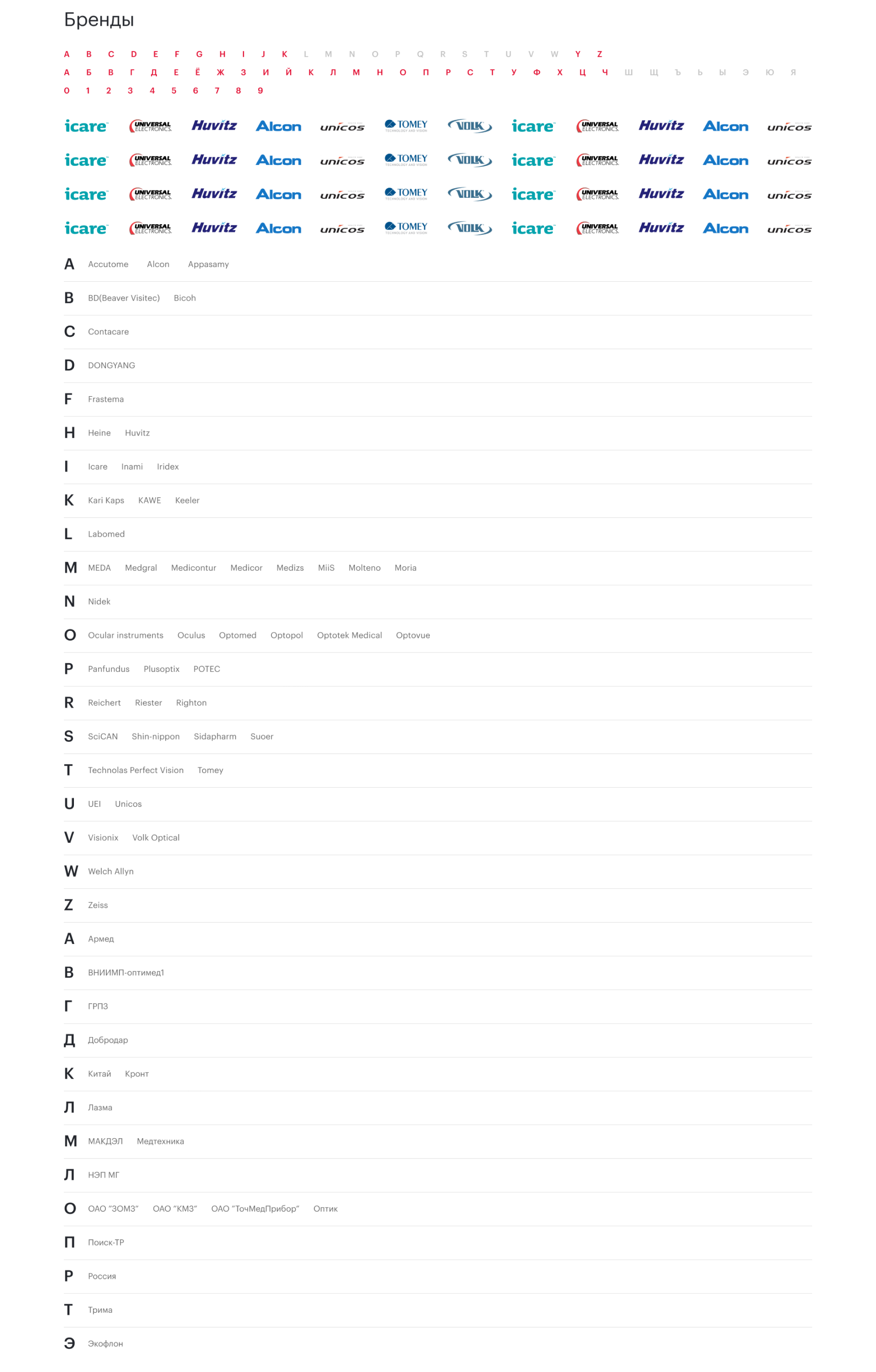 Бренды представлены списком в алфавитном порядке.