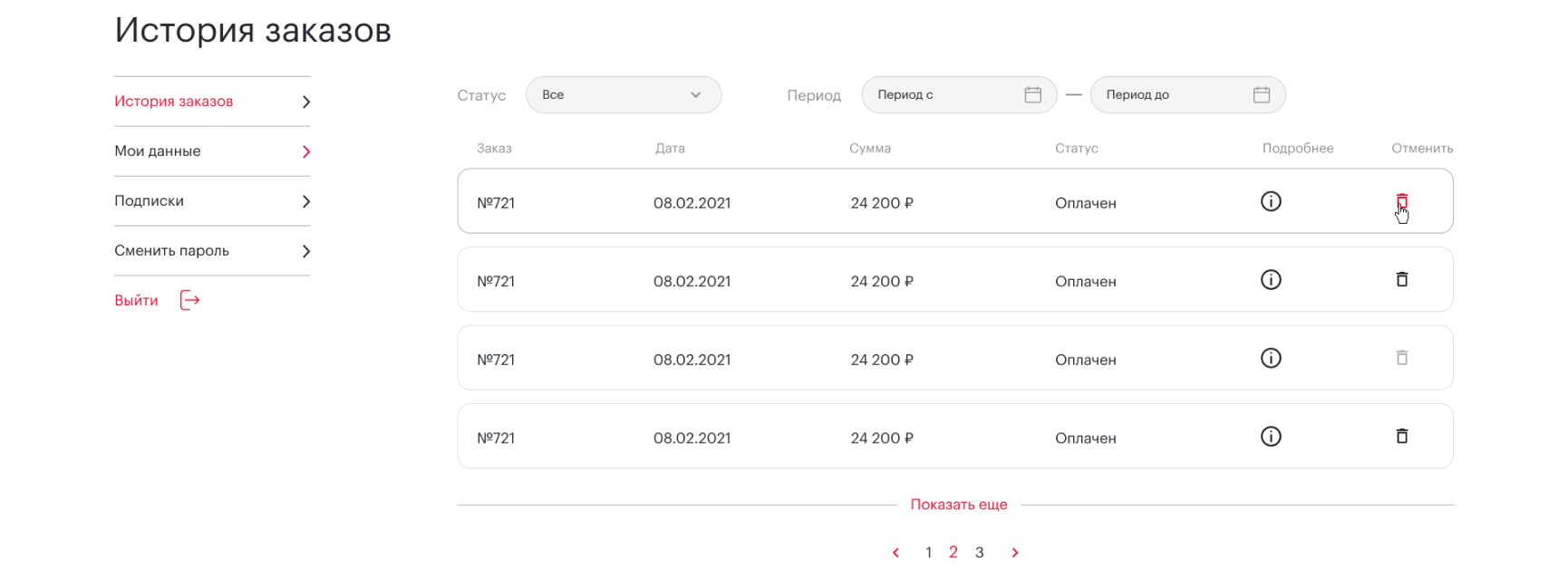 • История заказов с возможностью детального просмотра данных по заказу и его отмене