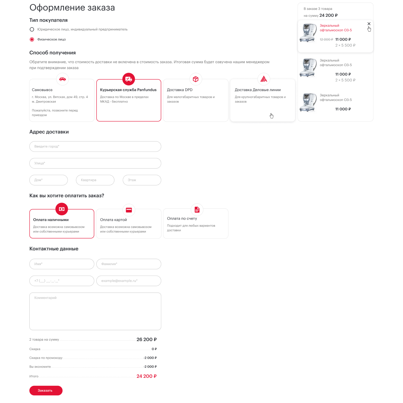 • Способ получения (самовывоз, курьерская служба, доставка DPD, доставка Деловые линии)